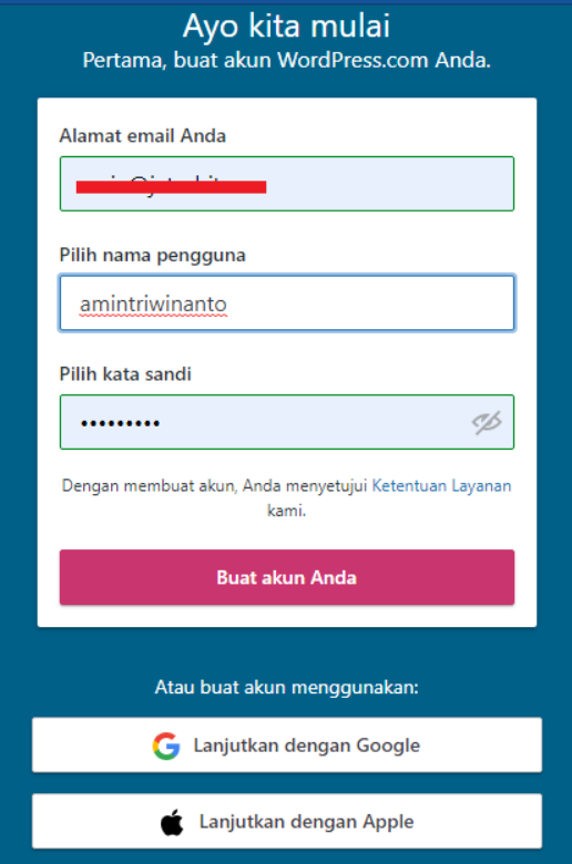 Anda bisa menggunakan akun Google atau Apple yang sudah ada dengan klik " lanjutkan dengan "  pada bagian bawah setelah itu klik Buat akun.